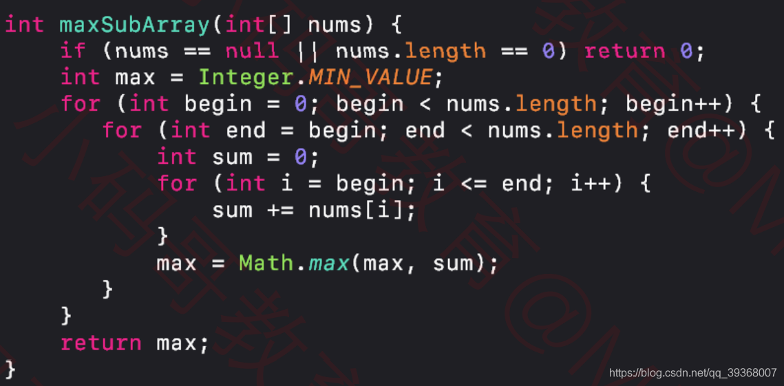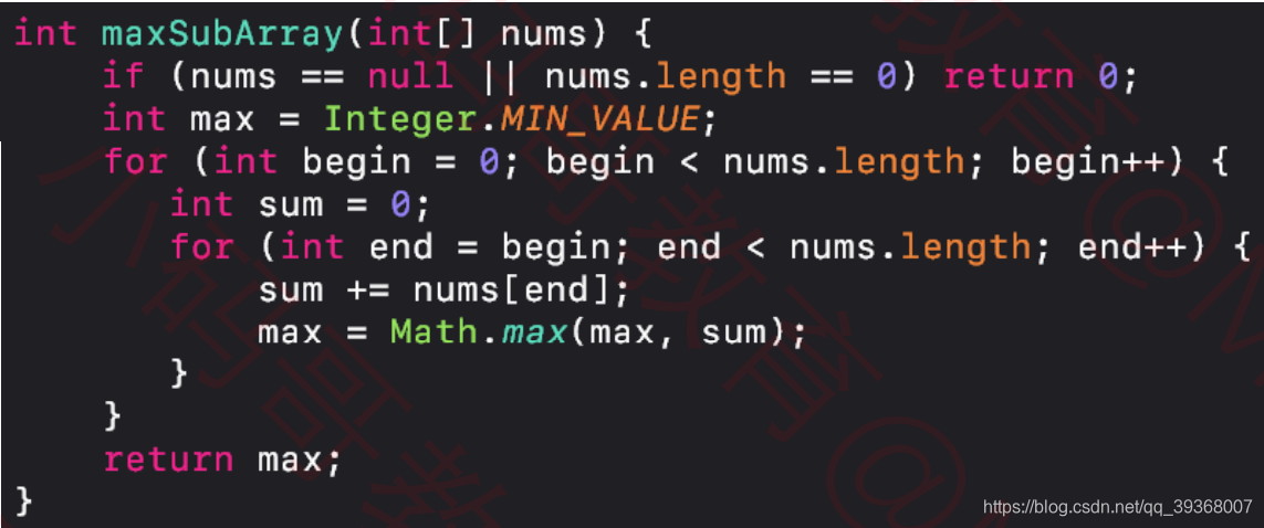 class Solution { public int maxSubArray(int[] nums) { if (nums == null || nums.length == 0) return 0; int max = Integer.MIN_VALUE; for (int begin = 0; begin < nums.length; begin++) { for (int end = begin; end < nums.length; end++) { // sum是[begin, end]的和 int sum = 0; for (int i = begin; i <= end; i++) { sum += nums[i]; } max = Math.max(max, sum); } } return max; }}